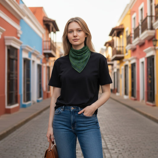 Green & Navy Blue Geometric Print Silk Scarf 26" x 26"