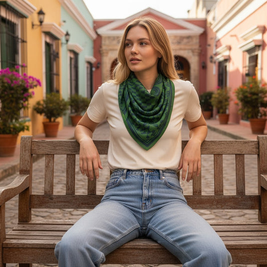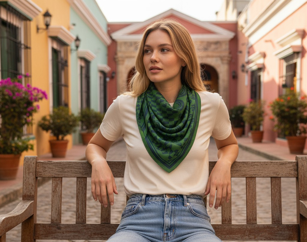 Green & Navy Blue Geometric Print Silk Scarf 36" x 36"
