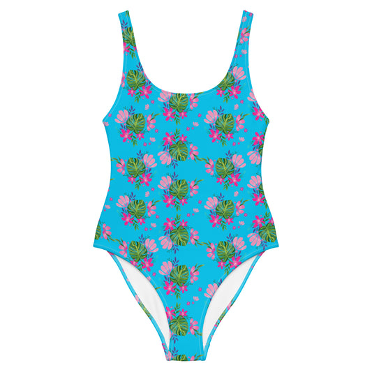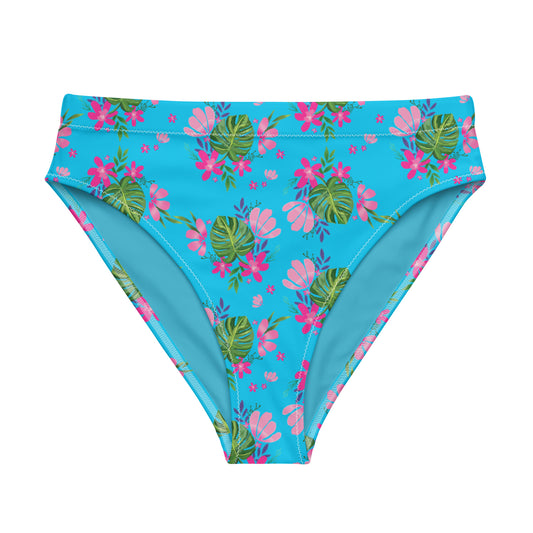 Blue Tropical Floral Print Eco Friendly High-Waisted Bikini Bottom