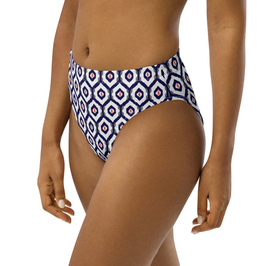 Blue & Coral Ikat Print Eco Friendly High-Waisted Bikini Bottom